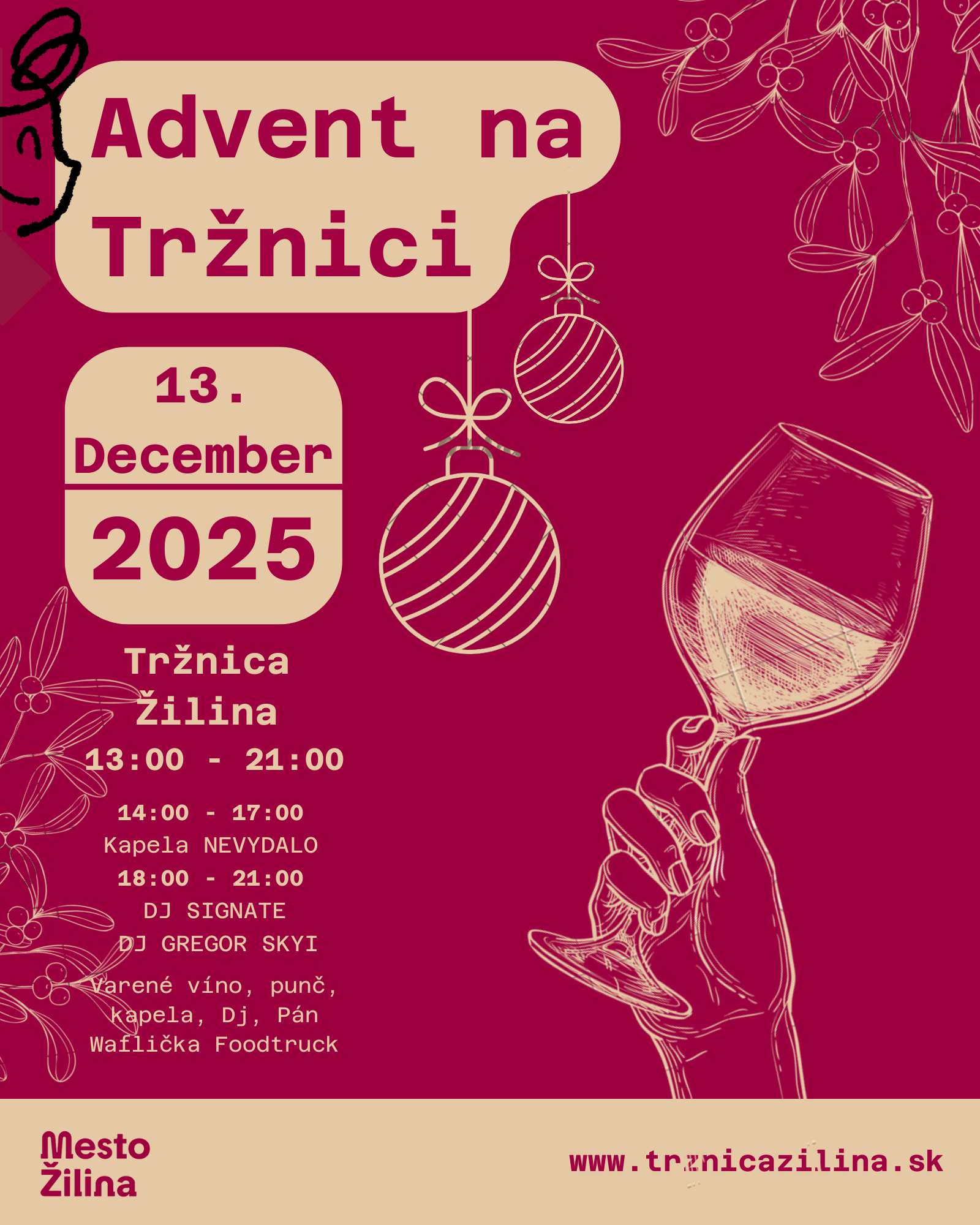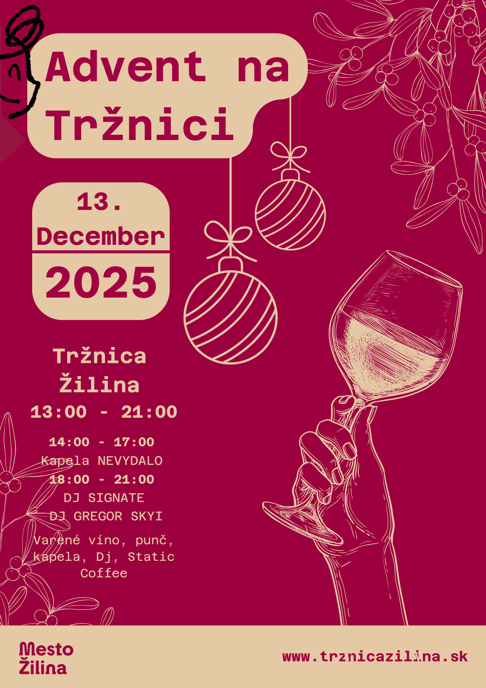 Tržnica Žilina prinesie aj tento rok predvianočnú atmosféru priamo do centra mesta. V sobotu 13. decembra 2025 sa od 13:00 do 21:00 uskutoční podujatie Advent na Tržnici, ktoré spojí hudbu, chutné zimné nápoje, dobré jedlo a stretnutia so známymi tvárami mesta.